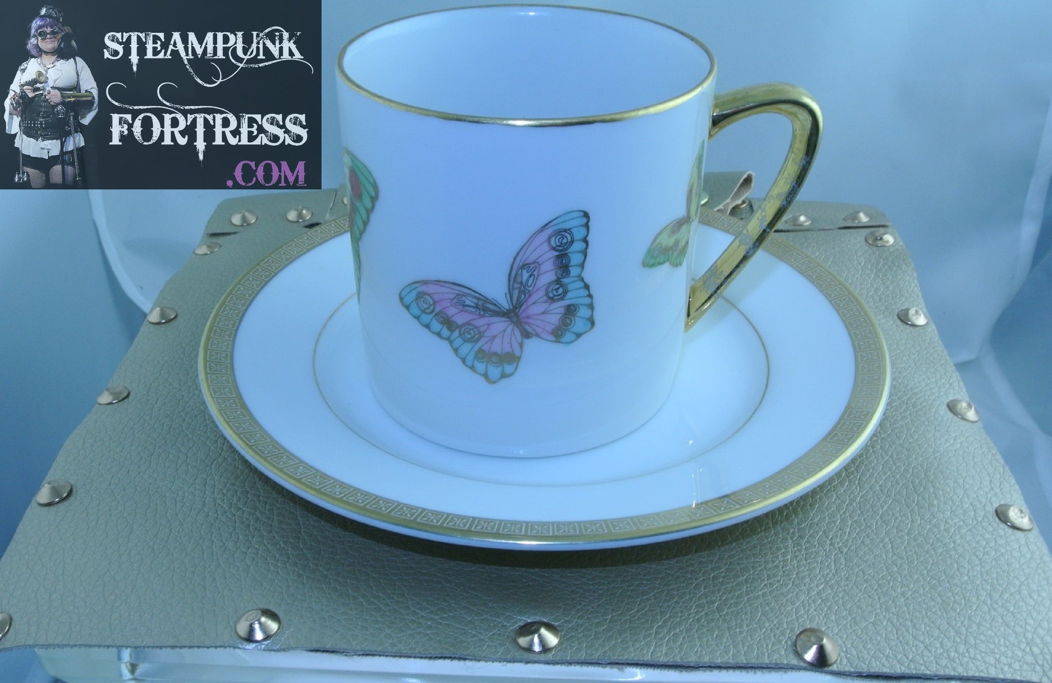THIS IS A FABULOUS HANDMADE STEAMPUNK TEA DUELLING SET CUP AND SAUCER HOLDER...GOLD FAUX LEATHER...WITH COPPER RIVETS....GOLD SNAPS CLOSURE ON EACH SIDE FOR EITHER RIGHT OR LEFT HAND ACCESS....THIS SET INCLUDES A PRE-LOVED NEARLY MATCHING CUP AND SAUCER SET...CUP HAS 5 PASTEL BUTTERFLIES ON IT AND GOLD HANDLE AND WE MATCHED IT WITH A GOLD TRIMMED REGENCY PLATE...WE MAKE THE SAUCER AREA A BIT ROOMY IN CASE YOU EVER NEED TO REPLACE YOUR SAUCER OR IF YOU NEED TO ADD TEA OR SPOON SO YOU HAVE SOME LEEWAY THERE....#1883