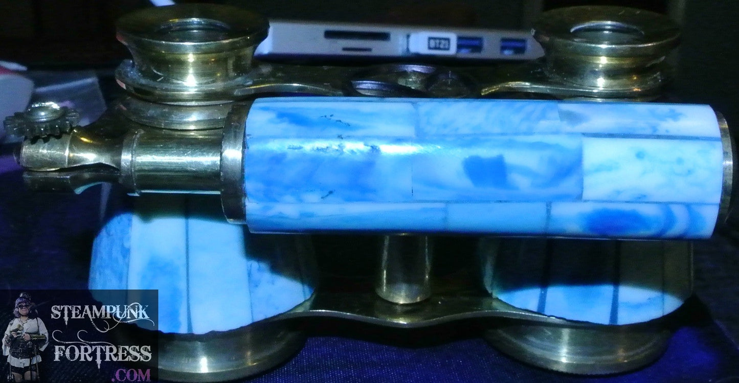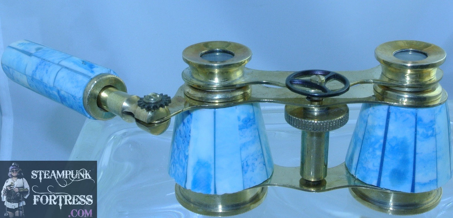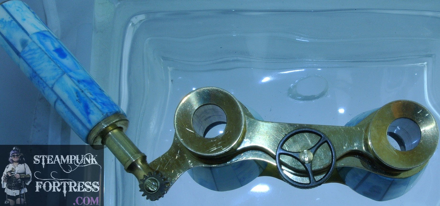 VINTAGE BLUE SWIRL BINOCULARS OPERA GLASSES EXTENDING HANDLE GOLD TRIM BRASS GEAR STARR WILDE STEAMPUNK FORTRESS