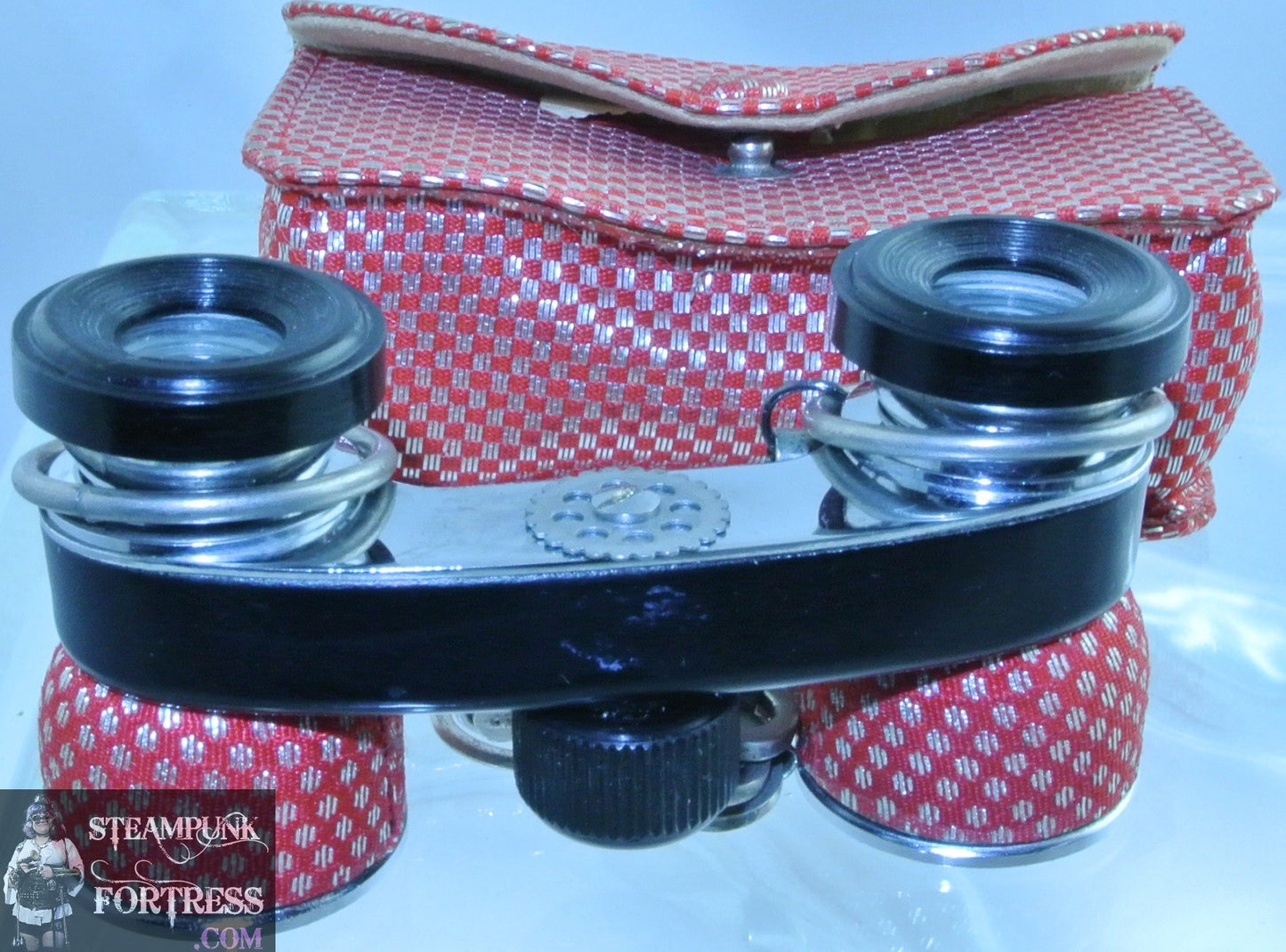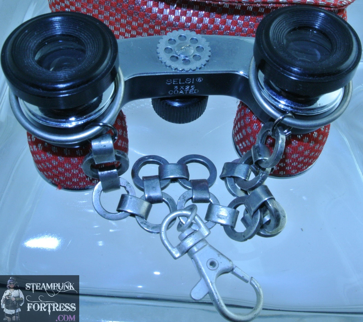 THIS IS A FABULOUS HANDMADE CUSTOM MADE STEAMPUNK DIESELPUNK CYBERPUNK, MEDIEVAL, RENAISSANCE, VICTORIAN, EDWARDIAN, COSPLAY, COSTUME, HALLOWEEN, SDCC, COMIC CON…..VINTAGE SELSI RED ALMOST STRAWBERRY LIKE PATTERN ON FABRIC BINOCULARS SILVER ROUND GEAR AND SILVER CHAIN AND CLASP...#3236