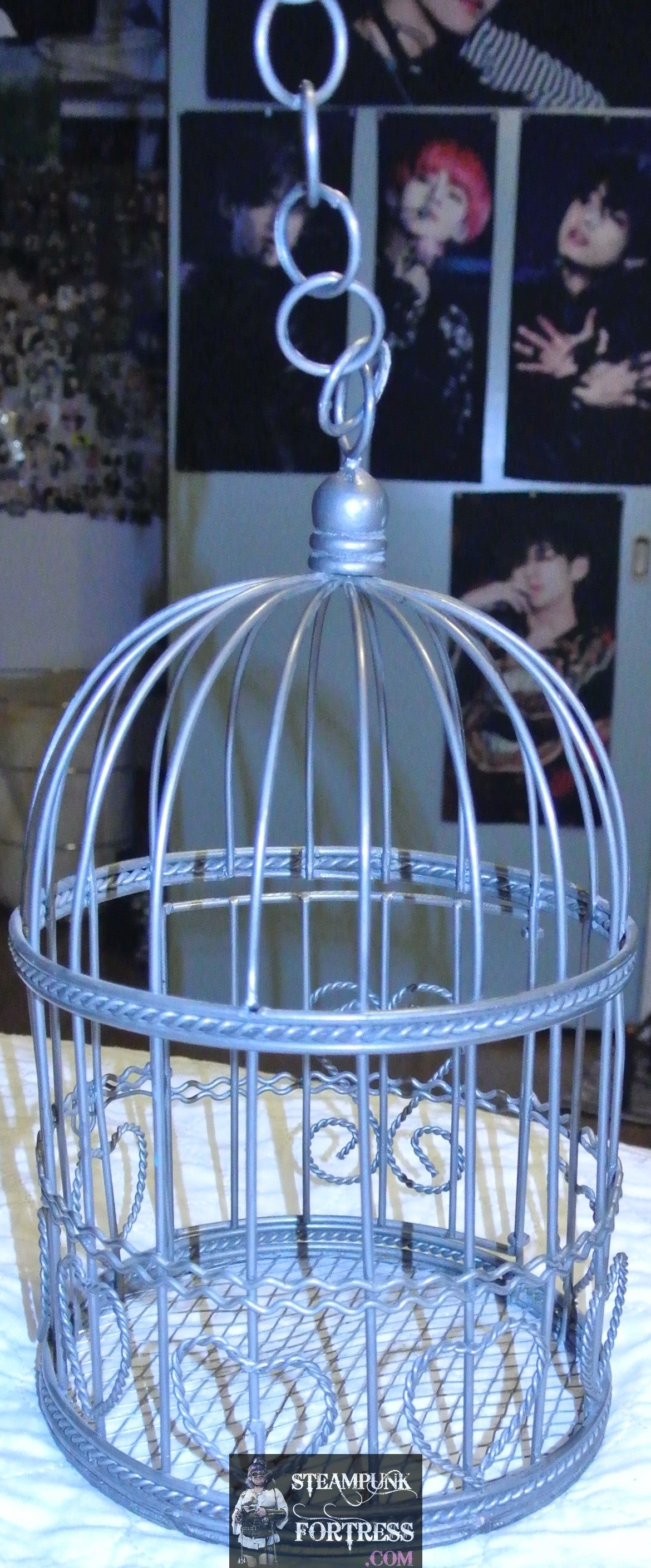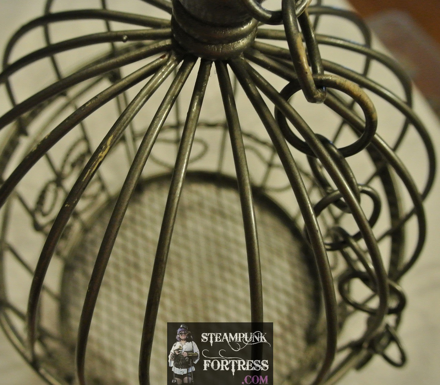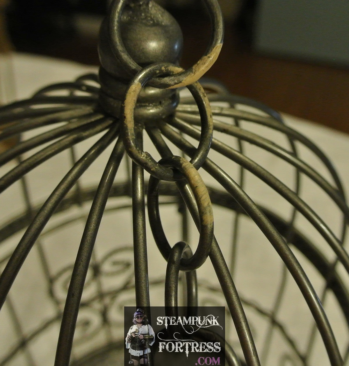 VINTAGE SILVER ROUND TWISTED WIRE BIRDCAGE BIRD CAGE DISPLAY HEARTS STEAMPUNK SHABBY CHIC CHAIN HANGER DOOR OPENS