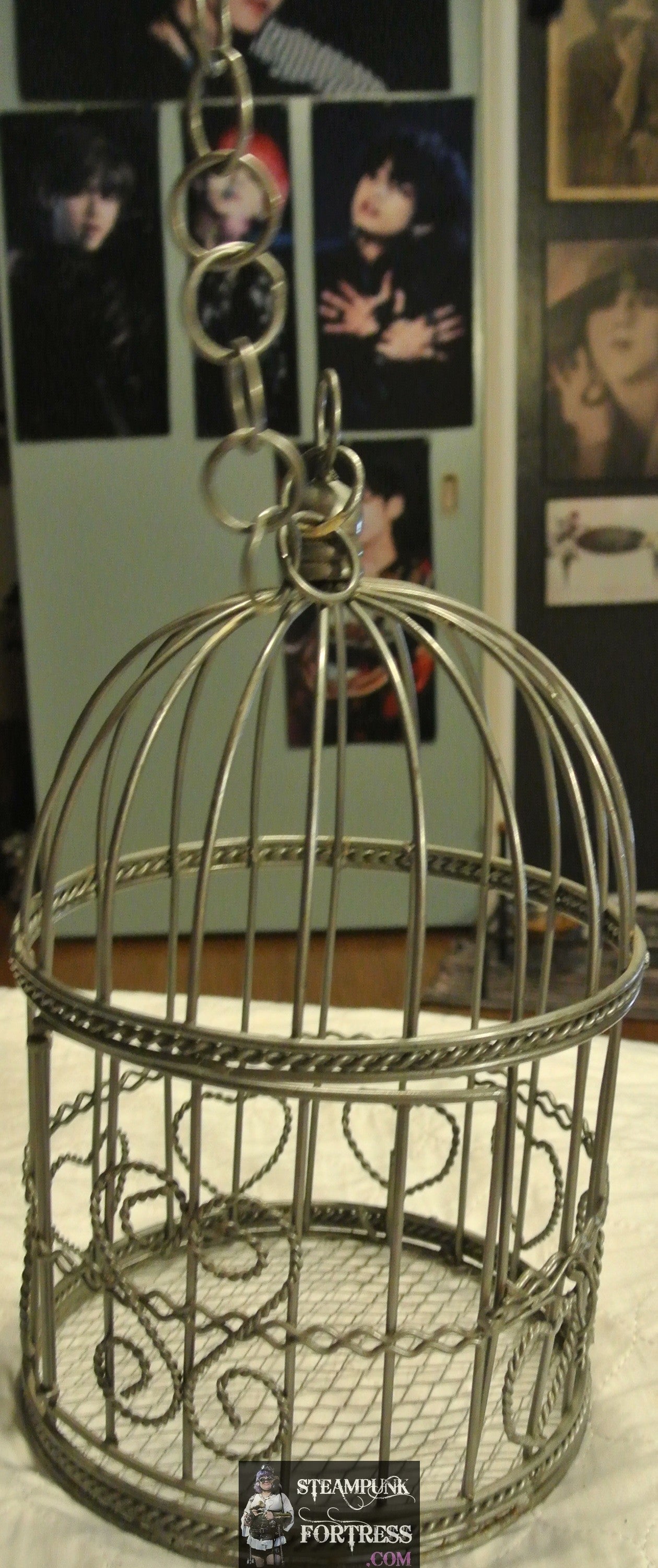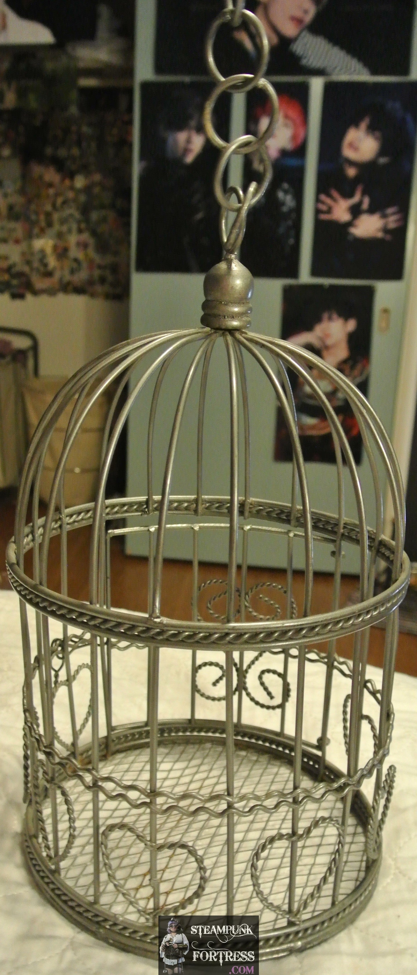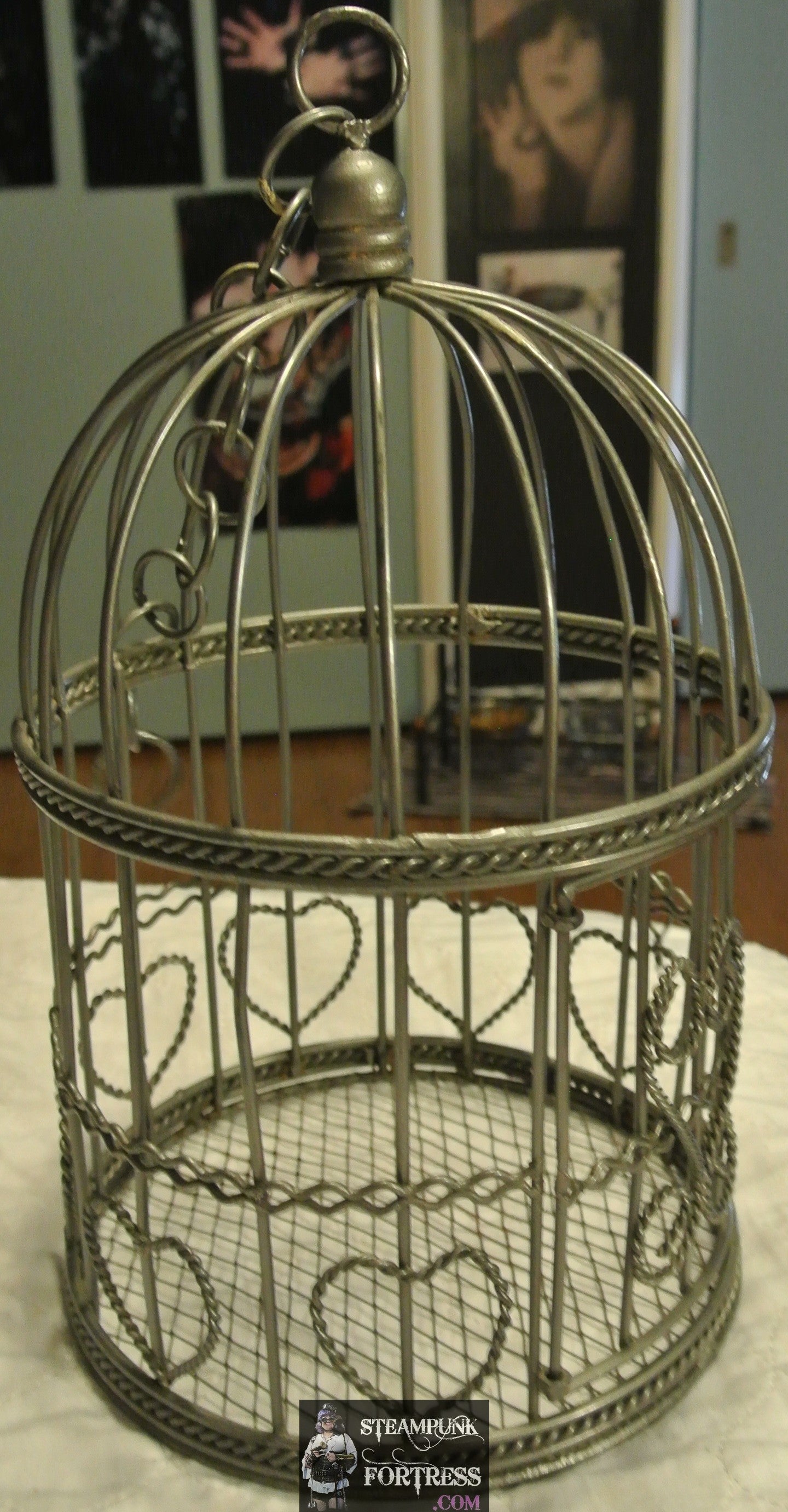 VINTAGE SILVER ROUND TWISTED WIRE BIRDCAGE BIRD CAGE DISPLAY HEARTS STEAMPUNK SHABBY CHIC CHAIN HANGER DOOR OPENS