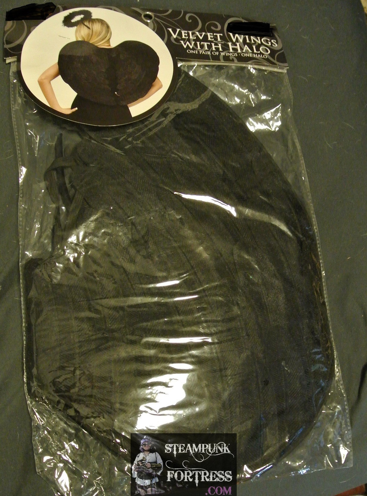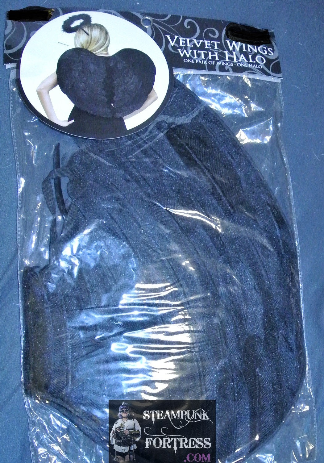 THIS IS A FABULOUS BLACK VELVET FABRIC FEATHER WINGS WITH HALO NEW IN PACKAGE....#7643